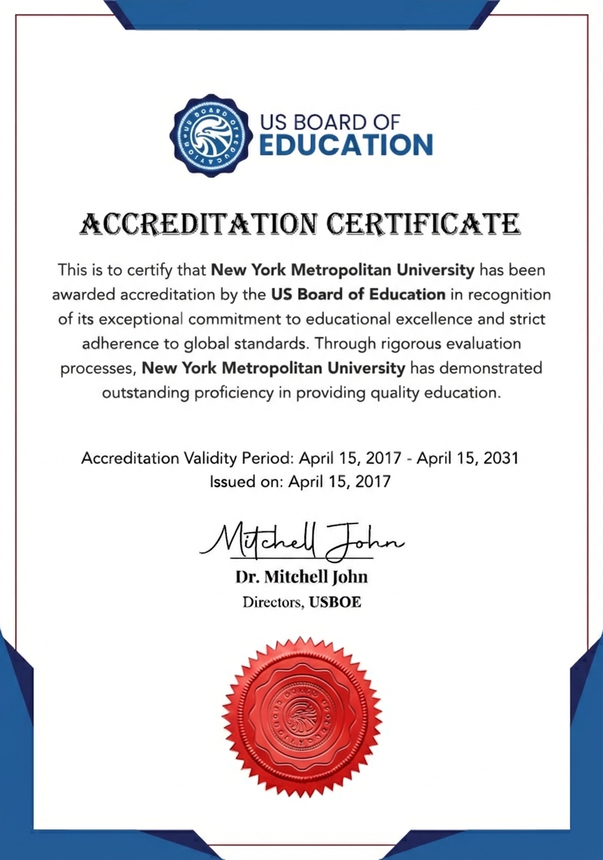 Along with regional and national accreditation, New York Metropolitan University also maintains specialized accreditation for its programs as appropriate to educational purposes and has more than 100 degrees/majors that have specialized accreditation. These programs benefit from the rigorous program review requirements in the accreditation process which are based on national standardized outcomes. New York Metropolitan University has attained membership of the following bodies: